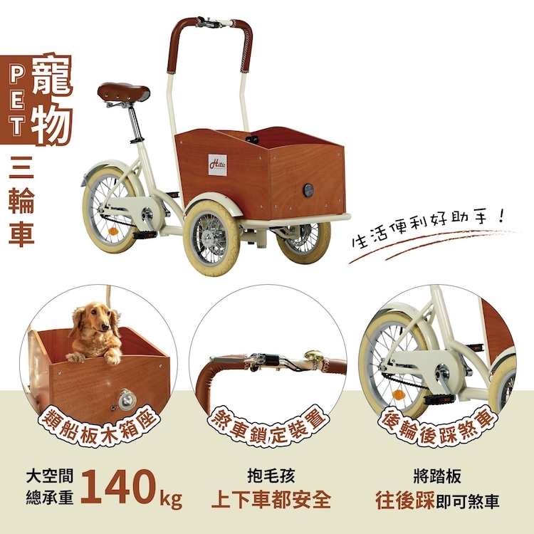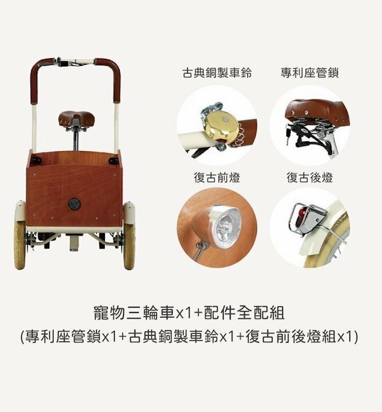 全配內含:寵物三輪車x1+配件全套組(專利座管鎖x1+古典銅製車鈴x1+復古前後燈組x1)